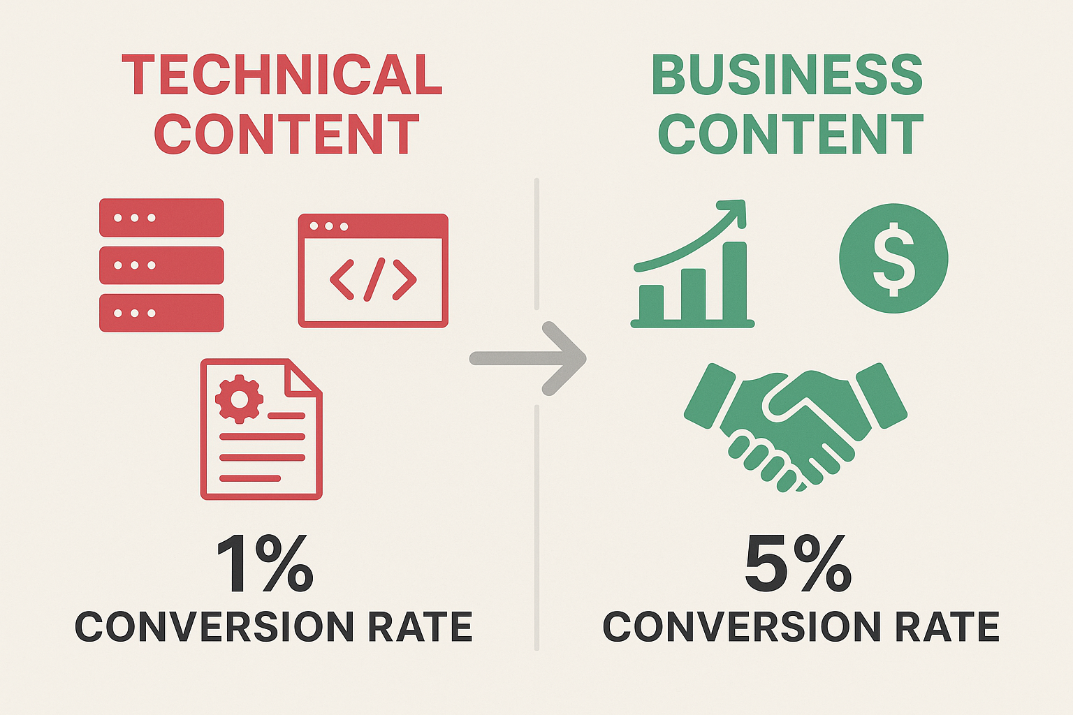 When your content focuses on technical solutions, you position yourself as a vendor who implements technology. When your content focuses on business outcomes, you position yourself as a strategic partner who helps businesses grow and succeed.